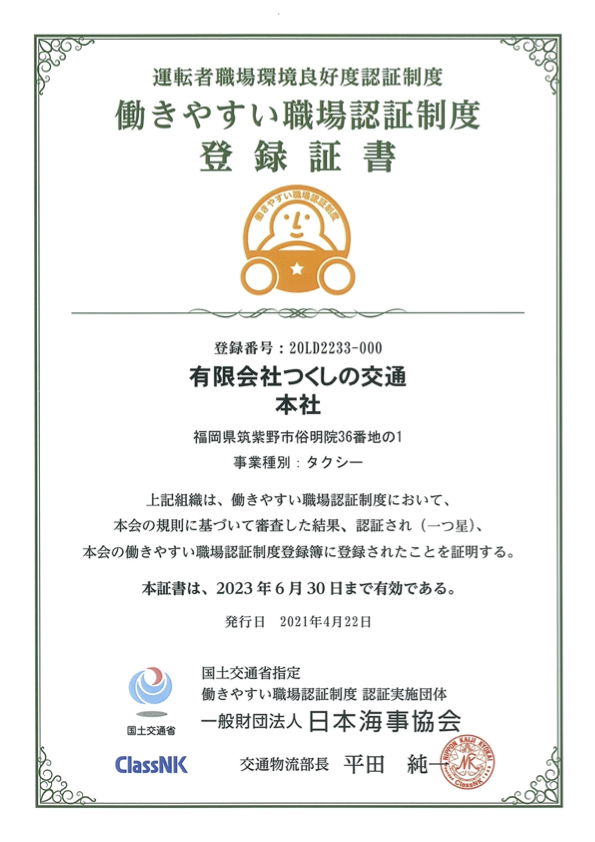 「働きやすい職場認証制度」の認定事業者に認定されました